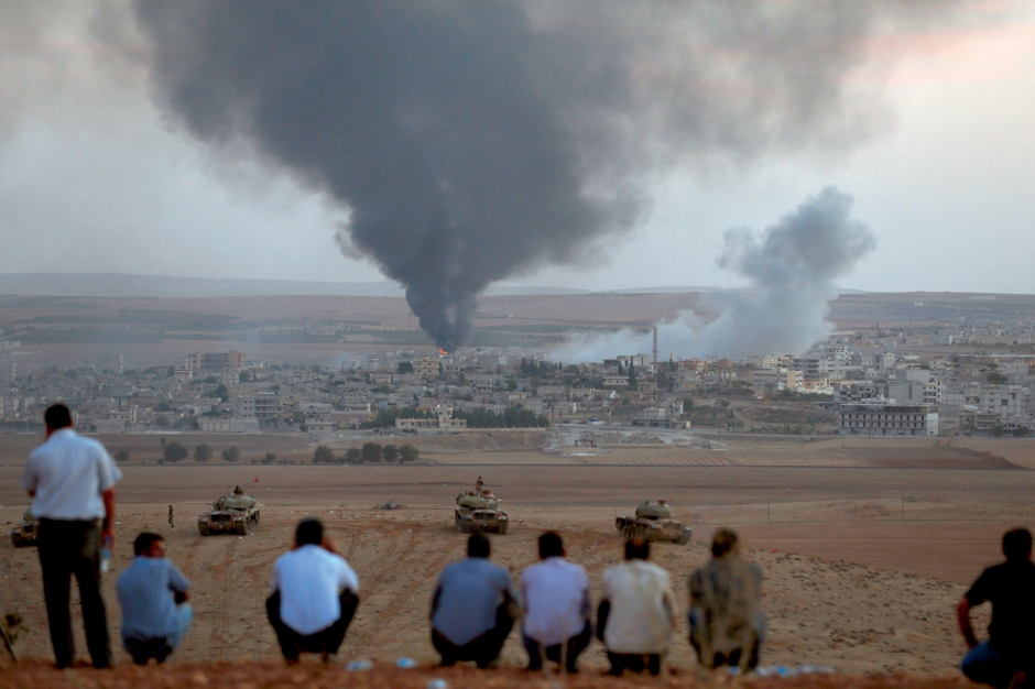 La frontière syrienne se situe après Suruç. La route traverse une plaine labourée. A 1 kilomètre du poste frontière, des gendarmes stoppent les voitures. De part et d’autre de la chaussée, des soldats casqués sont blottis dans des trous, près de leurs transports de troupes blindés, pour se protéger des obus de mortier qui tombent de temps en temps. Pour voir Kobané, il faut gravir les collines qui dominent la ville. Sur les crêtes, l’armée turque a déployé des escadrons de chars qui pointent leurs canons vers la Syrie. En bas, la bataille fait rage. Les islamistes ont pris l’est de la cité. Ils ont planté leur drapeau noir sur un mamelon et assiègent sur trois côtés cette agglomération d’une cinquantaine de milliers d’habitants. Resteraient à l’intérieur sept cents personnes qui, âgées, se terrent chez elles et, selon les forces kurdes, dix mille autres qui se seraient entassés contre la frontière. Des armes automatiques crépitent dans les quartiers ouest, d’où montent trois colonnes de fumée grise. Le staccato plus « gras » d’une mitrailleuse qui tire des rafales courtes couvre le bruit des fusils d’assaut. Soudain, une explosion sourde, suivie d’une autre et d’une épaisse fumée noire qui monte dans le ciel. « C’est un camion chargé de munitions de Daech qui vient d’exploser sous le coup d’une roquette de RPG-7 », m’assure un Kurde pendu à son téléphone portable depuis vingt minutes. « C’est mon frère qui vient de me l’annoncer. Il est dans le groupe qui a fait le coup », me dit l’inconnu avec un sourire de satisfaction. Un bruit me fait lever la tête. J’ai beau scruter les nuages fins qui cachent parfois le soleil, je n’arrive pas à voir le chasseur de la coalition qui tourne au-dessus de nous.