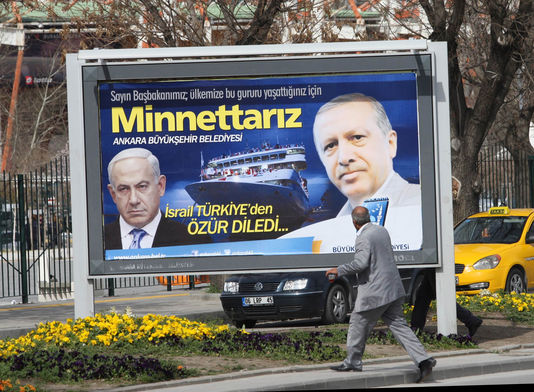La rupture des relations diplomatiques entre les deux pays avait été provoquée par la mort en 2010 de neuf militants turcs lors de l’arraisonnement violent d’une flottille partie pour briser l’embargo imposé par l’Etat hébreu à la bande de Gaza. Ici à Ankara en Turquie, le 25 mars 2013.