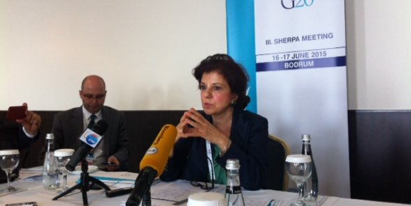 L’ambassadrice du G20 en Turquie, AyÅŸe SinirlioÄŸlu, assure que le G20 est une occasion de promouvoir la finance islamique « qui constitue une opportunité pour l’économie mondiale ». Ici, l’ambassadrice en conférence de presse à Bodrum, le 15 juin 2015. (Crédits : SB)