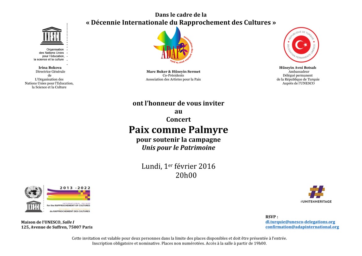 Vous êtes cordialement invité au concert « Paix comme Palmyre », le lundi 1er février à l’UNESCO: de la bonne musique pour une très belle cause !