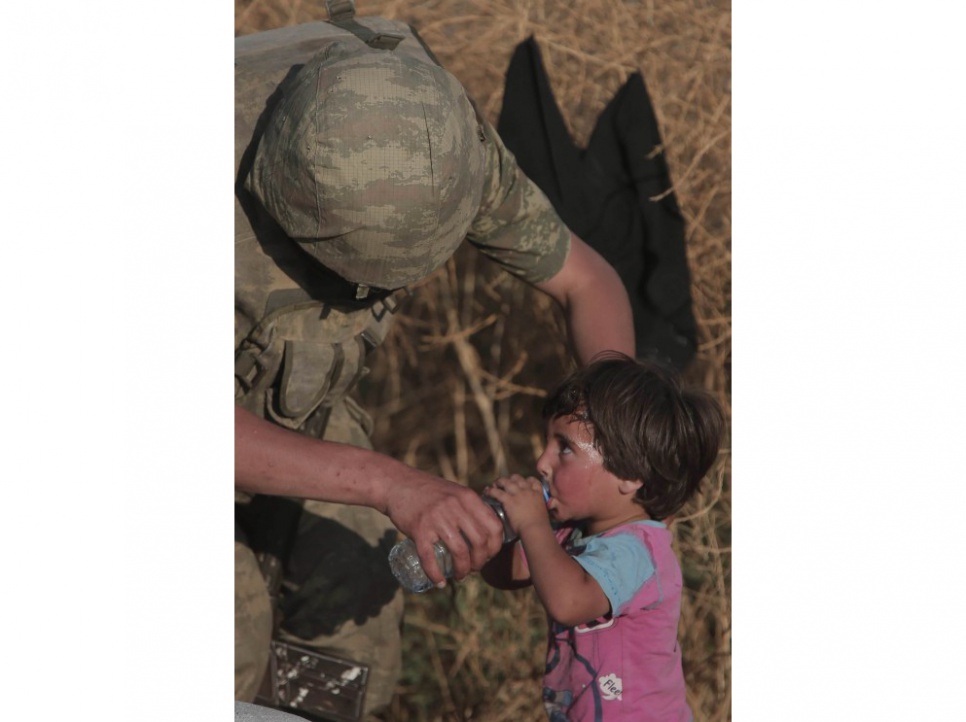 Un soldat turc offre de l’eau à un jeune enfant. (Lefteris Pitarakis/AP/SIPA)