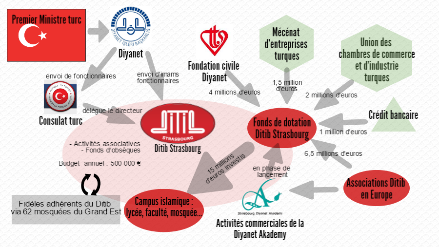 Trois ans plus tard, son chargé de projet Murat Ercan a pris la tête du Conseil régional du culte musulman (CRCM). En tout, l’association emploie déjà 10 personnes grâce à un budget annuel d’environ 500 000€. La structure est hybride. Sous statut d’association de droit local alsacien-mosellan, l’organisation est sous la tutelle directe d’Ankara : le réseau des Ditib maille l’Europe et représente auprès de la diaspora la Direction turque des affaires religieuses, la Diyanet, rattachée directement au Premier ministre turc. À ce titre, c’est un fonctionnaire de la Diyanet, Fevzi Hamurcu, qui préside le Ditib Strasbourg.