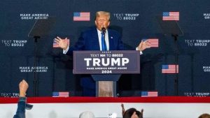 L’ancien président des États-Unis et candidat républicain à l’élection présidentielle de 2024, Donald Trump, s’exprime lors d’un meeting de campagne à Derry, dans le New Hampshire, le 23 octobre 2023. | JOSEPH PREZIOSO / AFP