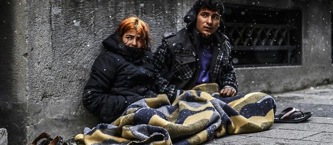 Des réfugiés syriens assis à même le trottoir, sous la neige d’Istanbul, le 7 janvier 2015. © BULENT KILIC / AFP