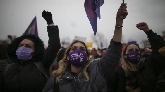 Manifestations en faveur du droit des femmes, en mars 2021 à Istanbul. © AP – Emrah Gurel