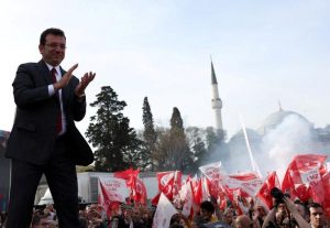 Le maire d’Istanbul, Ekrem Imamoglu, candidat du Parti républicain du peuple pour les municipales, lors d’un meeting électoral, à Istanbul le 30 mars 2024.
