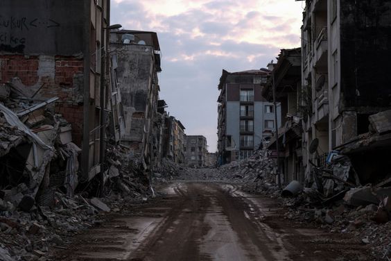Une rue transformée en impasse par les débris d’immeubles effondrés, le 24 février 2023 à Hatay, en Turquie. (Mehmet Kacmaz / Getty Images)