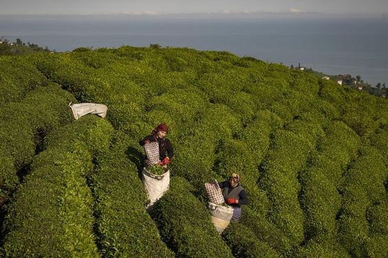 Des cueilleurs récoltent des feuilles de thé dans un champ de la province de Rize, au nord-est de la Turquie, le 10 mai 2024. Yasin Akgul / AFP