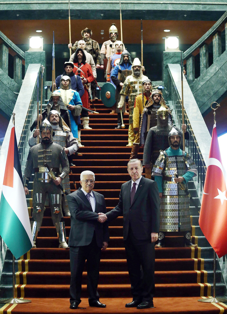 Le président turc n’a pas hésité à se faire photographier, accompagné du leader palestinien, au milieu des guerriers historiques.