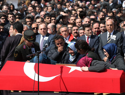 Lors des funérailles du procureur tué lors d’une prise d’otage mardi 31 mars à Istanbul. Emrah Gurel / AP