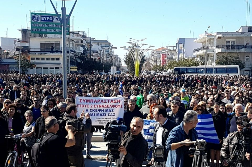 Manifestation à Orestiada, ville grecque près de la frontière avec la Turquie, pour soutenir les soldats grecs détenus en Turquie, le 11 mars 2018 – Photo Stringer. AFP