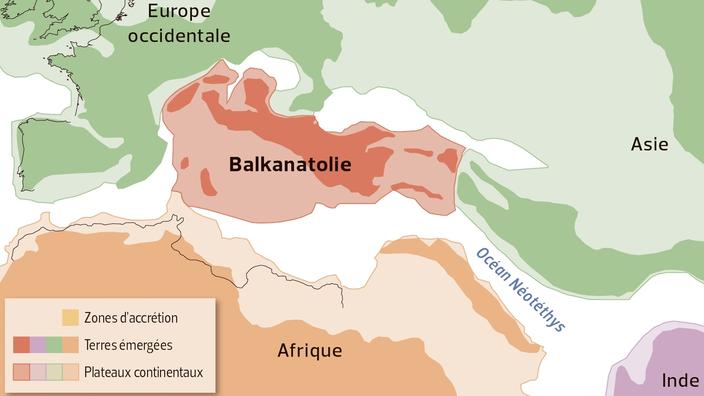 Face à tant de mystères, il a d’abord fallu s’assurer que les datations de ces découvertes étaient correctes. La plupart des fossiles mis au jour correspondaient à des espèces, ou des groupes référencés à des époques beaucoup plus lointaines. «Ensuite, nous avons travaillé sur des scénarios qui pouvaient expliquer ces présences inattendues», poursuit Alexis Licht. La solution repose donc sur l’existence de ce continent totalement isolée des autres. L’histoire géologique de la Balkanatolie est connue depuis quelques années. Elle se compose de fragments d’un ancien continent appelé «Grand Adria», issu du supercontinent Gondwana.