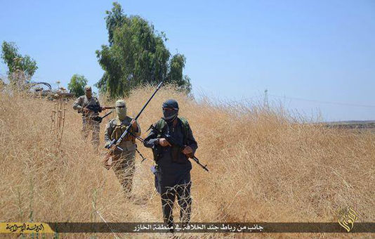 Des combattants de l’Etat islamique patrouillent près de Mossoul en 2014.