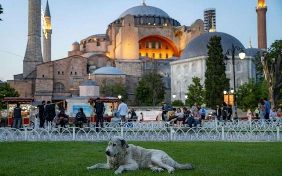 Un chien errant assis devant la Grande Mosquée Hagia, à Istanbul, le 30 mai 2024AFP – Yasin AKGUL