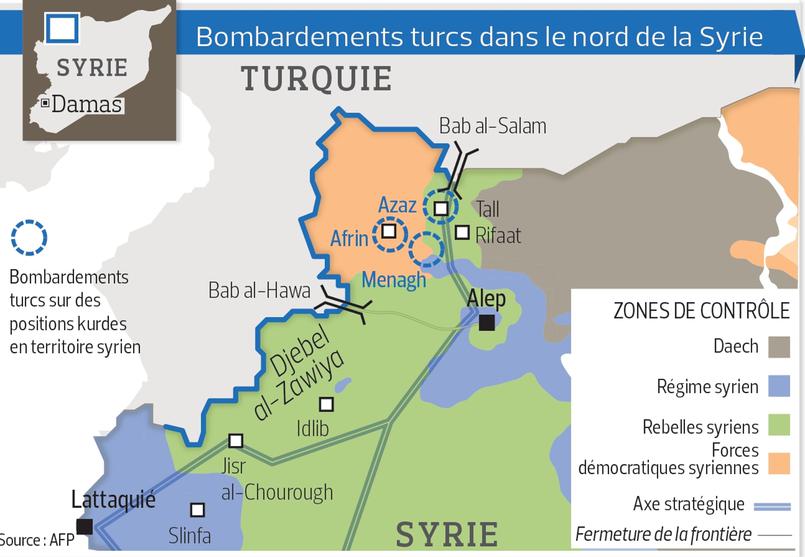 Officiellement, l’armée turque a «riposté» à des tirs provenant d’en face, notamment des abords de l’aéroport militaire de Menagh, repris le 10 février par ces forces kurdes à des opposants islamistes. Selon l’Observatoire syrien des droits de l’homme, au moins deux miliciens kurdes auraient été tués. Ankara a annoncé dans la foulée avoir répliqué à d’autres tirs visant sa province d’Hatay, plus à l’ouest, et provenant cette fois-ci de positions de l’armée syrienne.