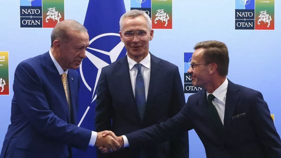 Le président Erdogan (à gauche) serre la main du Premier ministre suédois Ulf Kristersson, en présence du secrétaire général de l’Otan Jens Stoltenberg, à Vilnius le 10 juillet. (YVES HERMAN / POOL / AFP)