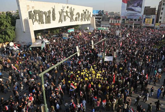 Le 12 décembre, à Baghdad, des membres de milices chiites irakiennes manifestent contre la présence militaire turque près de Mossoul, dans le nord de l’Irak.