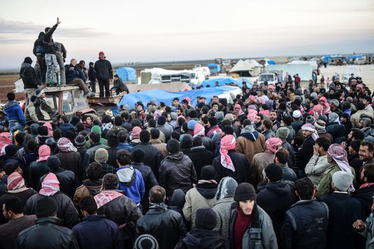 Des réfugiés venus d’Alep se pressent à Bab Al-Salama, dans le nord de la Syrie, à la frontière turque, le 5 février. BULENT KILIC/AFP