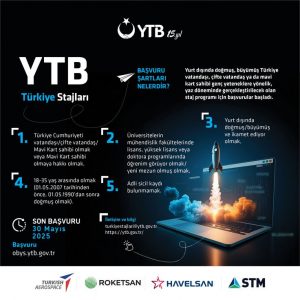 Yurtdışı Türkler Başkanlığı (YTB) tarafından, üniversite’de lisans, yüksek lisans ve doktora düzeyindeki mühendislik ve ilişkili öğrenim gören 18-35 yaş arasındaki vatandaşlarımızın TUSAŞ, HAVELSAN, ROKETSAN ve STM gibi savunma sanayii şirketlerinde staj programlarına katılabilme imkanları sağlanacaktır.