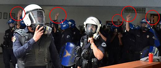 Et c’est ce même symbole qui aurait été fait par des policiers à l’université d’Ankara, selon des étudiants. D’autres policiers pointaient également un index en l’air comme en témoigne cette photo publiée sur les réseaux sociaux et les médias turcs.