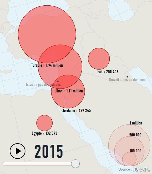 Notre carte, construite à partir des données du HCR, présente l’intégralité des personnes « réfugiées » au sens du HCR ( http://bit.ly/1LUmGMj ). En effet, si en Europe, les autorités utilisent volontiers le mot « migrants » pour définir les Syriens qui cherchent à se rendre sur le continent, le HCR ne fait quasiment aucune distinction.