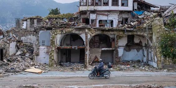 Un homme traverse en moto les quartiers en ruine de la ville de Hatay (sud de la Turquie), le 5 février 2024. (SOPA Images/SIPA)