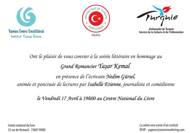 Quant à Isabelle Etienne, diplômée en lettres et philosophie, universitaire puis diplomate, elle se consacre désormais à des activités de journalisme littéraire et à une carrière de comédienne. Elle apportera le charme de sa présence en animant cette soirée qui s’annonce passionnante, organisée à l’initiative de l’Ambassade de Turquie en hommage aux œuvres et aux écrits de Yasar Kemal.