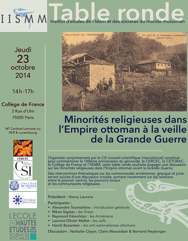 Organisée conjointement par le CSI (conseil scientifique international) constitué pour commémorer le 100ème anniversaire du génocide, le CERCEC, le CETOBAC, le Collège de France et l’IISMM, cette table ronde souhaite engager une discussion sur le minorités religieuses dans l’Empire ottoman avant la Grande Guerre.