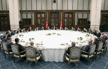 Le président turc Recep Tayyip Erdogan (c), lors d’un repas avec des dignitaires religieux pendant le mois du ramadan, le 22 juin 2015 dans le palais présidentiel à Ankara © PRESIDENTIAL PRESS OFFICE/AFP/Archives