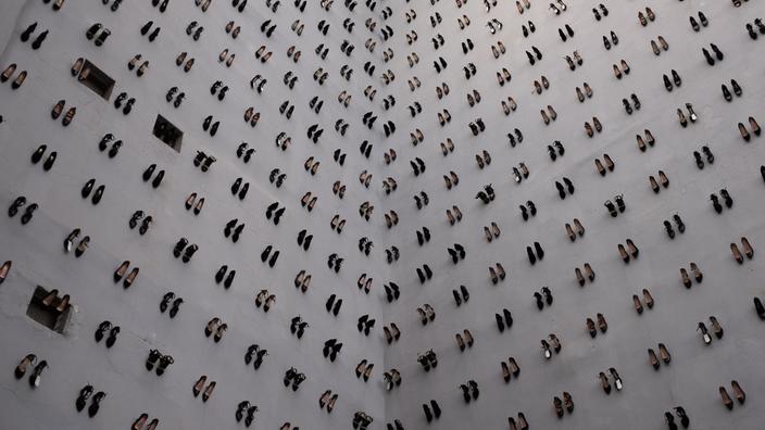 Un happening sur un mur d’istanbul, signé par l’artiste Vahit Tuna: 440 paires d’escarpins noirs pour le nombre de féminicides en Turquie en 2018. Marie Tihon