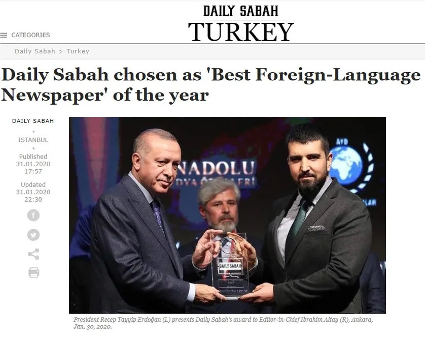 La liberté de la presse plus que jamais en question dans la Turquie de Recep Tayyip Erdogan, avec des craintes qui s’illustrent dans une seule photo trouvée ce week-end sur le site du quotidien anglophone The Daily Sabah, très fier de nous annoncer qu’il a reçu jeudi soir le prix du meilleur média en langue anglaise de Turquie attribué par la très puissante Association des Editeurs de presse d’Anatolie.