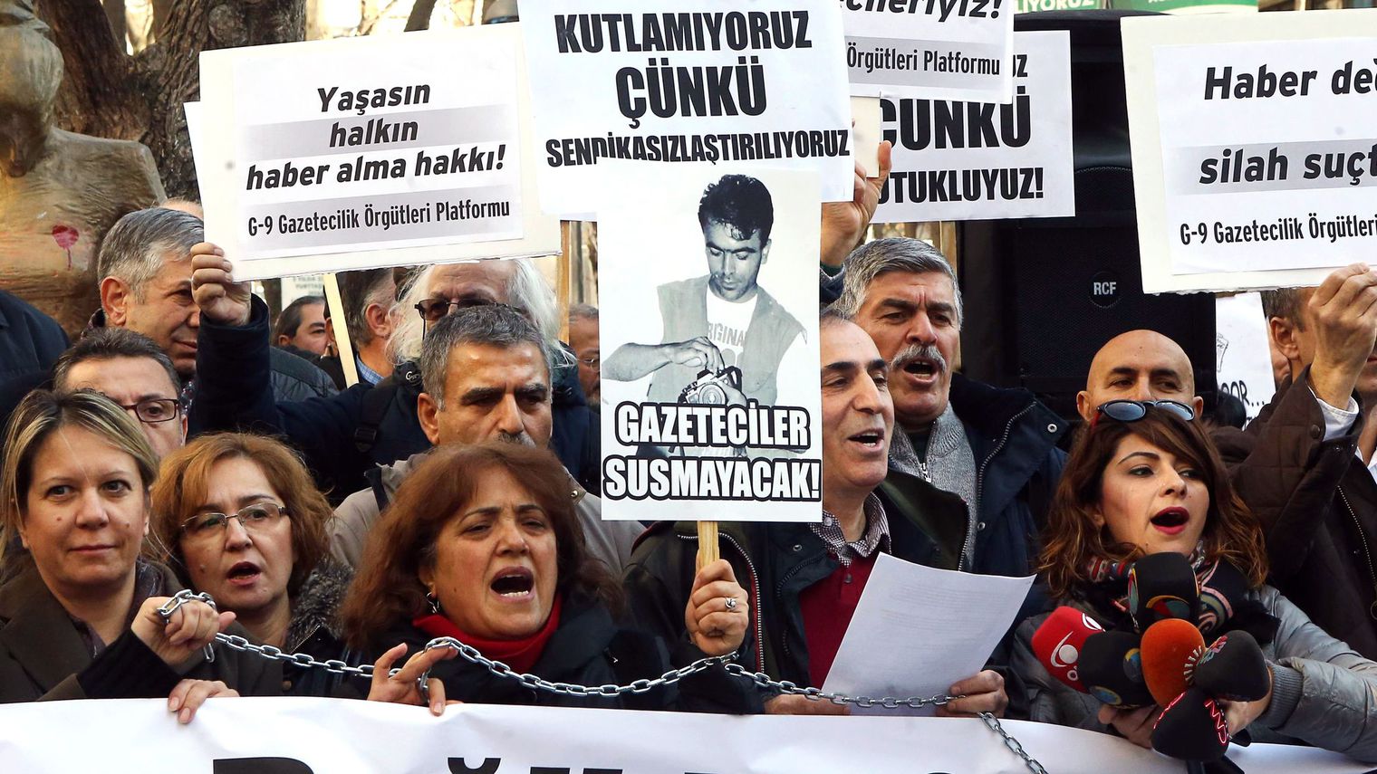 Manifestation de journalistes turcs en soutien à Can Dündar, rédacteur en chef de Cumhuriyet, et Erdem Gül, le chef du bureau de ce quotidien à Ankara, le 10 janvier 2016 à Ankara afp.com/ADEM ALTAN