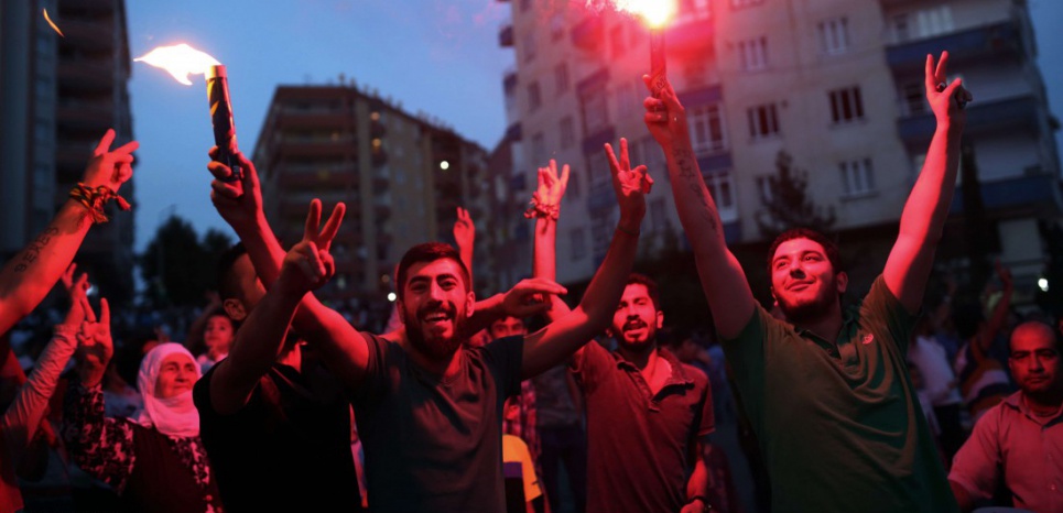 A la fermeture des bureaux de vote, l’ambiance était encore tendue, notamment par crainte de fraudes lors du dépouillement. Mais sitôt les résultats confirmés, des milliers de personnes sont descendues dans les rues de Diyarbakir, la « capitale » kurde du sud-est de la Turquie, pour célébrer la victoire du HDP en agitant des drapeaux et en klaxonnant, les passagers hissés aux travers des fenêtres de voitures, les doigts fièrement écartés en « V » en signe de victoire. Quelques coups de feu ont même été tirés en l’air.