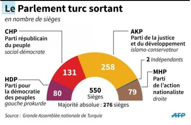 Les enquêtes d’opinions créditent cette fois son Parti de la justice et du développement (AKP) de 40 à 43% des intentions de vote, un score insuffisant pour gouverner seul.