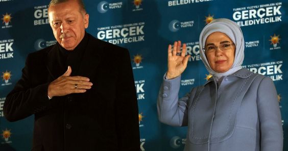 Le président turc Recep Tayyip Erdogan et son épouse Emine Erdogan au siège du parti islamo-conservateur AKP, à l’issue des municipales qui ont vu la victoire de l’opposition, à Ankara le 1er avril 2024 / afp.com/Adem ALTAN