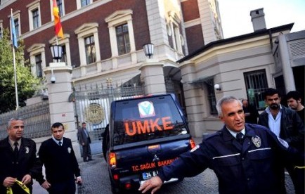 Des équipes de biologistes et chimistes au consulat allemand après la réception d’enveloppes contenant une poudre blanche suspecte, le 24 octobre 2014 à Istanbul, en Turquie Des équipes de biologistes et chimistes au consulat allemand après la réception d’enveloppes contenant une poudre blanche suspecte, le 24 octobre 2014 à Istanbul, en Turquie