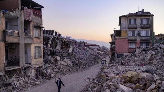Un homme passe devant des bâtiments effondrés à Antakya, dans le sud de la Turquie, le 20 février 2023. Photo de Yasin AKGUL / AFP – AFP