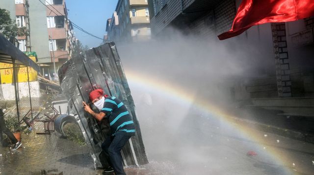 Un manifestant se protège contre un canon à eau lors de heurts avec la police à Istanbul, en Turquie, le 26 juillet 2015. BULENT KILIC/AFP
