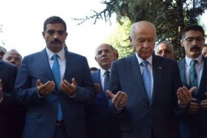 Sinan Ates (à gauche) priant aux côtés du leader du MHP Devlet Bahceli en juillet 2022. Photo tirée du compte Twitter de Sinan Ates